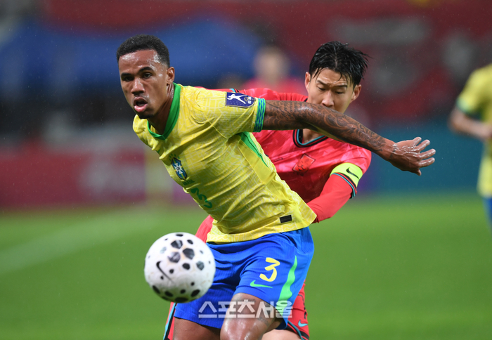 브라질 마갈량이스가 10일 서울월드컵경기장에서 열린 남자 축구 국가대표 평가전 한국과 경기에서 손흥민과 볼다툼을 하고 있다.