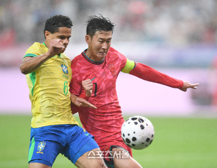 손흥민이 10일 서울월드컵경기장에서 열린 남자 축구 국가대표 평가전 브라질과 경기에서 더글라스 산토스와 볼다툼을 하고 있다.