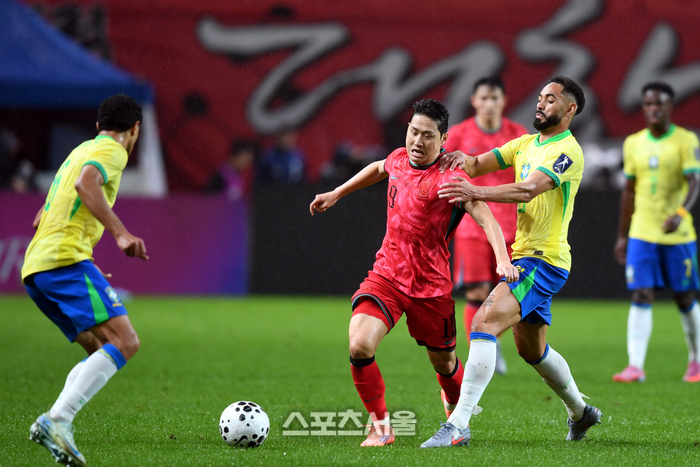 이강인이 10일 서울월드컵경기장에서 열린 남자 축구 국가대표 평가전 브라질과 경기에서 상대를 따돌리고 드리블을 하고 있다.