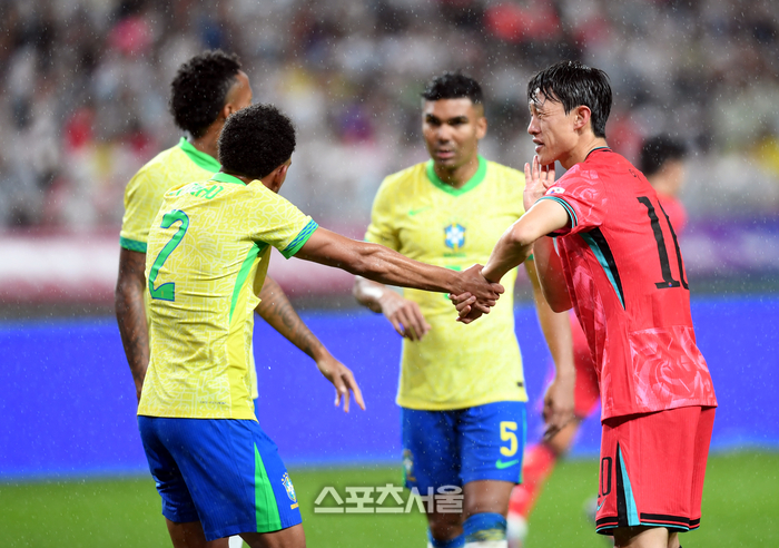 이재성이 10일 서울월드컵경기장에서 열린 남자 축구 국가대표 평가전 브라질과 경기에서 골중볼 다툼 중 부딪힌 상대 비닌유와 악수를 하고 있다.