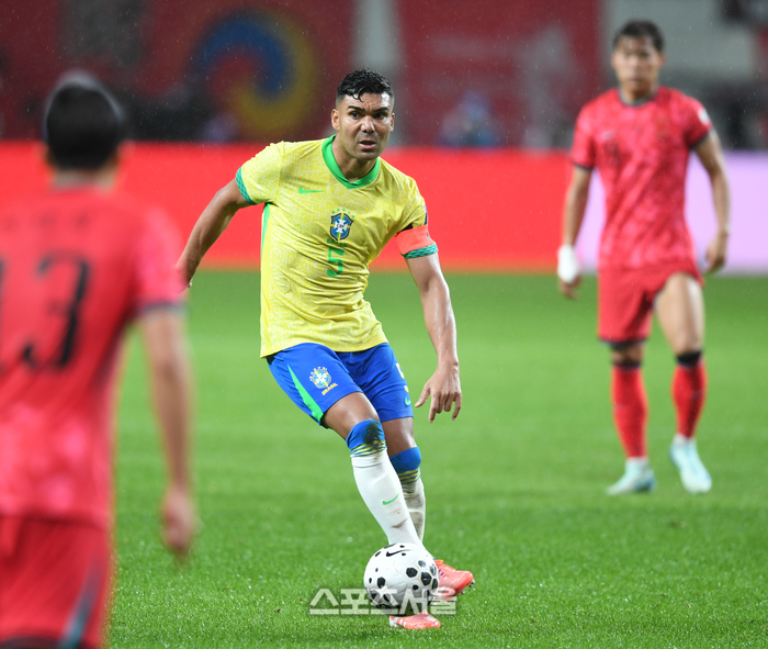 브라질 카세미루가 10일 서울월드컵경기장에서 열린 남자 축구 국가대표 평가전 한국과 경기에서 패스할 곳을 찾고 있다.