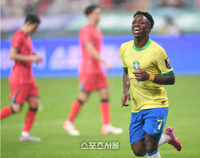 브라질 비니시우스가 10일 서울월드컵경기장에서 열린 남자 축구 국가대표 평가전 한국과 경기에서 골을 넣은 후 환호하고 있다.