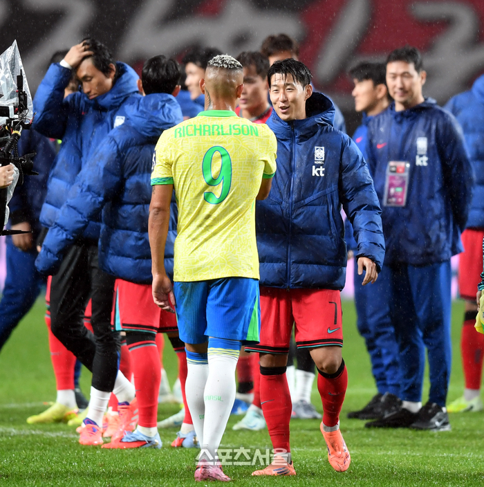 손흥민이 10일 서울월드컵경기장에서 열린 남자 축구 국가대표 평가전 브라질과 경기 후 히샬리송과 악수를 하고 있다.