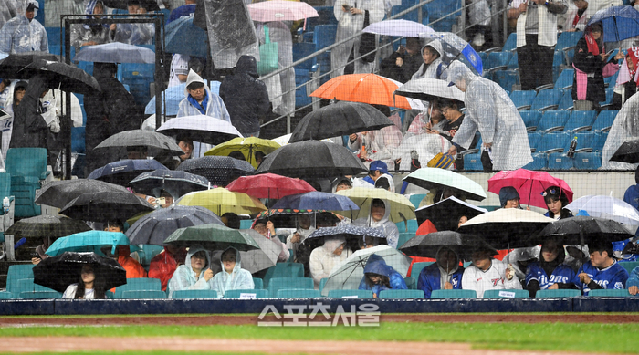 13일 대구 삼성라이온즈파크에서 열리는 2025 KBO리그 SSG와 삼성의 준플레이오프 3차전 1회말 비로 인해 경기가 중단되자 관중들이 우산을 쓰고 재개를 기다리고 있다. 2025. 10. 13.