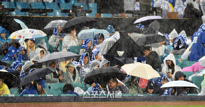 13일 대구 삼성라이온즈파크에서 열리는 2025 KBO리그 SSG와 삼성의 준플레이오프 3차전 1회말 비가 쏟아지자 관중들이 우산을 펼치고 있다. 2025. 10. 13.
