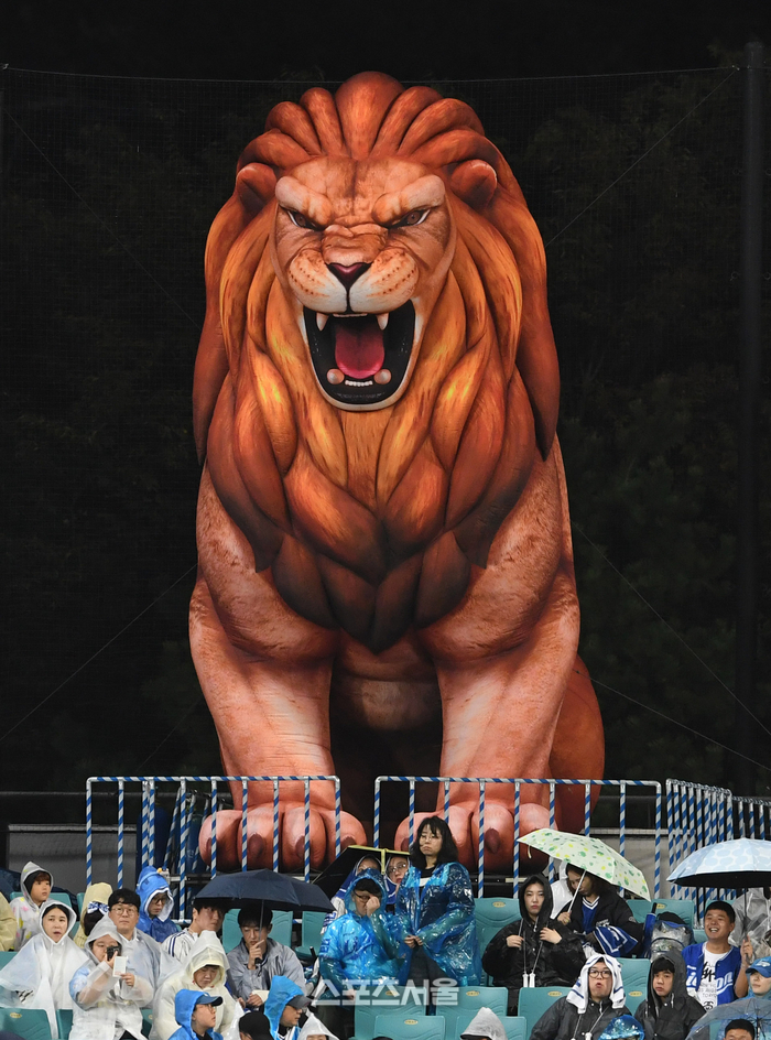 13일 대구 삼성라이온즈파크에서 열리는 2025 KBO리그 SSG와 삼성의 준플레이오프 3차전에서 대형 사자 모형이 외야에 설치돼 있다. 2025. 10. 13.