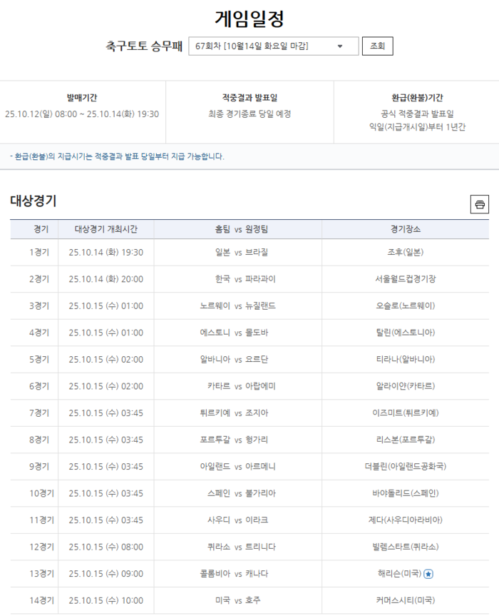 오는 14일 오후 7시30분까지 구매가 가능한 축구토토 승무패 67회차는 한국-파라과이(2경기), 일본-브라질(1경기)전 등 A매치 빅매치를 비롯해 스페인-불가리아(10경기), 포르투갈-헝가리(8경기), 미국-호주(14경기) 등 세계 각국 주요 대표팀 경기들이 예정돼 있다.