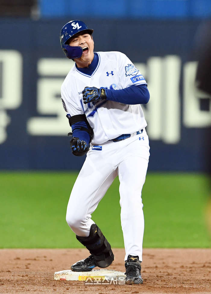 삼성 구자욱이 13일 대구 삼성라이온즈파크에서 열린 2025 KBO리그 SSG와의 준플레이오프 3차전 3회말 2사 2루 상황에서 SSG 선발 앤더슨을 상대로 1타점 2루타를 친 뒤 기뻐하고 있다. 2025. 10. 13.