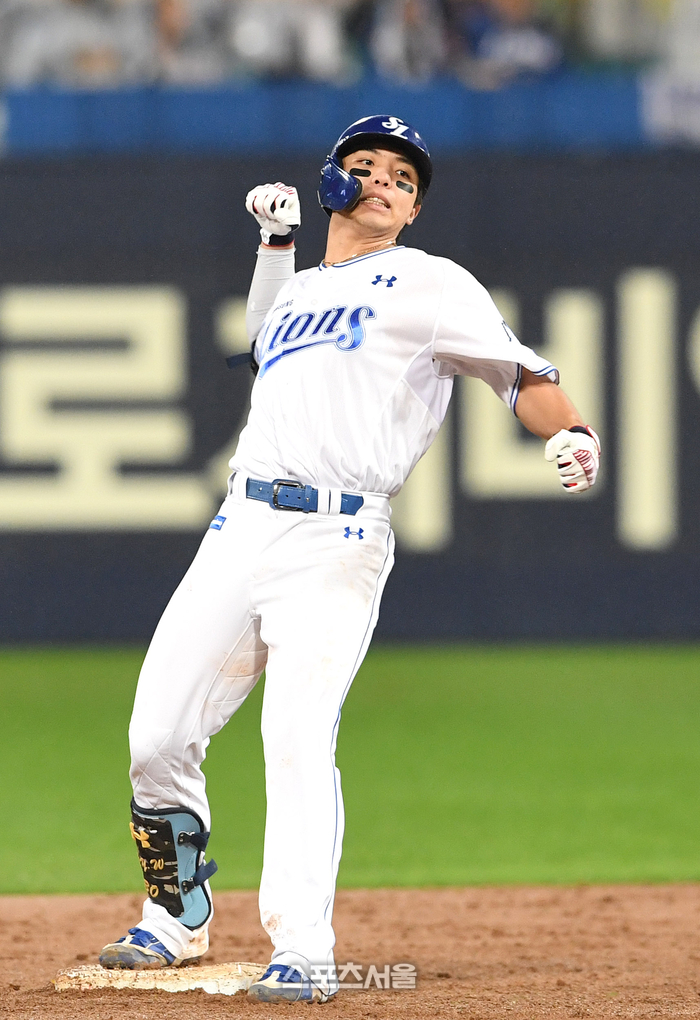 삼성 김영웅이 13일 대구 삼성라이온즈파크에서 열린 2025 KBO리그 SSG와의 준플레이오프 3차전 5회말 2사 1-2루 상황에서 SSG 이로운을 상대로 1타점 2루타를 친 뒤 기뻐하고 있다. 2025. 10. 13.