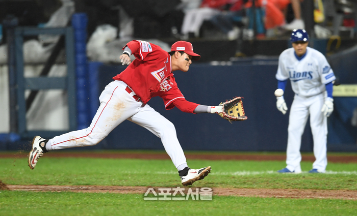 SSG 1루수 고명준이 13일 대구 삼성라이온즈파크에서 열린 2025 KBO리그 삼성과의 준플레이오프 3차전 6회말 무사 2루 상황에서 삼성 강민호의 번트 타구가 뜨자 달려가 잡아내고 있다. 2025. 10. 13.