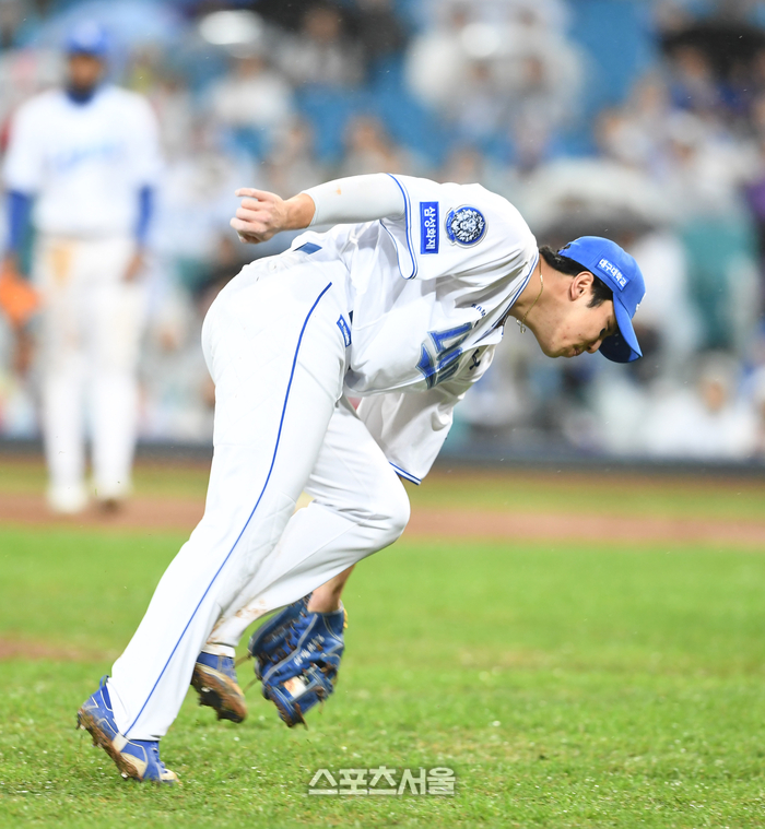 삼성 3루수 김영웅이 13일 대구 삼성라이온즈파크에서 열린 2025 KBO리그 SSG와의 준플레이오프 3차전 8회초 1사 SSG 에리디아의 땅볼 타구를 놓쳤다가 다시 잡아내고 있다. 김영웅은 타구를 잡는 과정에서 허리 부상을 입고 전병우로 교체됐다. 2025. 10. 13.