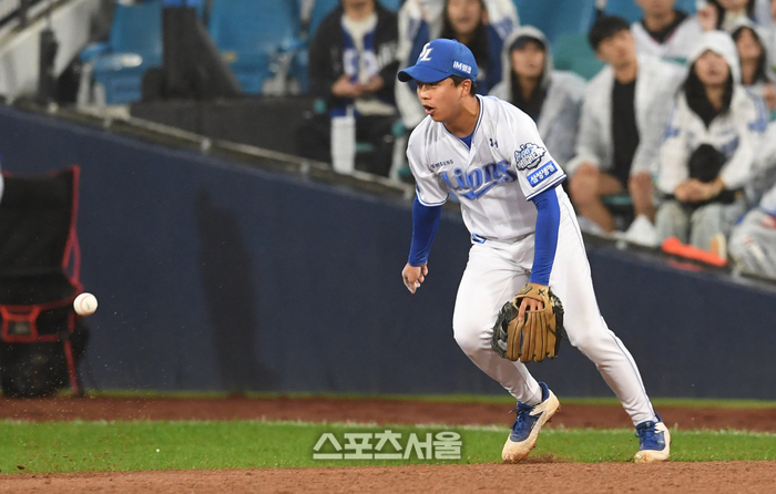 삼성 2루수 양동근(왼쪽)이 13일 대구 삼성라이온즈파크에서 열린 2025 KBO리그 SSG와의 준플레이오프 3차전 9회초 무사 SSG 류효승의 플라이를 놓치고 있다. 2025. 10. 13.