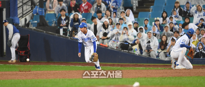 삼성 2루수 양동근(왼쪽)이 13일 대구 삼성라이온즈파크에서 열린 2025 KBO리그 SSG와의 준플레이오프 3차전 9회초 무사 SSG 류효승의 플라이를 놓치고 있다. 2025. 10. 13.