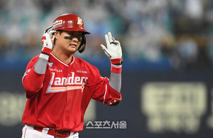 SSG 고명준이 13일 대구 삼성라이온즈파크에서 열린 2025 KBO리그 삼성과의 준플레이오프 3차전 9회초 무사 1루 삼성 배찬승을 상대로 추격 2점 홈런을 치고 세리머니를 하고 있다. 2025. 10. 13.
