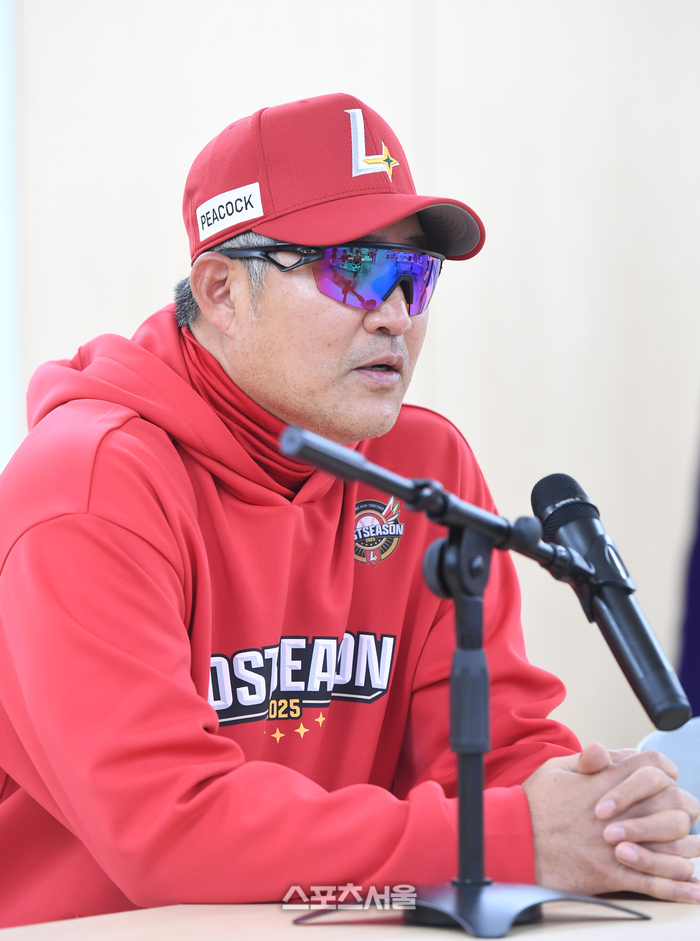 SSG 이숭용 감독이 14일 대구 삼성라이온즈파크에서 열리는 2025 KBO리그 삼성과의 준플레이오프 4차전에 앞서 인터뷰를 하고 있다. 2025. 10. 14.