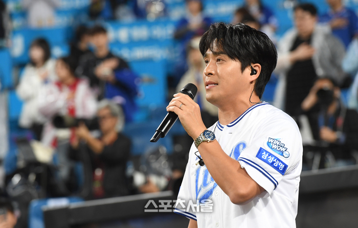가수 먼데이키즈가 14일 대구 삼성라이온즈파크에서 열린 2025 KBO리그 SSG와 삼성의 준플레이오프 4차전에 앞서 애국가를 열창하고 있다. 2025. 10. 14.