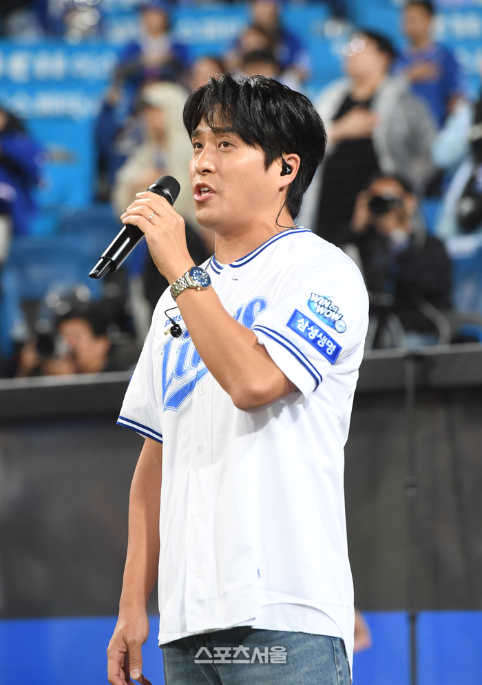 가수 먼데이키즈가 14일 대구 삼성라이온즈파크에서 열린 2025 KBO리그 SSG와 삼성의 준플레이오프 4차전에 앞서 애국가를 열창하고 있다. 2025. 10. 14.