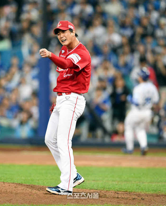 SSG 김광현이 14일 대구 삼성라이온즈파크에서 열린 2025 KBO리그 삼성과의 준플레이오프 4차전 3회말 1사 1-2루 삼성 김성윤의 3루 땅볼 때 3루 베이스를 밟지 않고 2루를 선택한 3루수 최정의 플레이에 아쉬워하고 있다. 2025. 10. 14.
