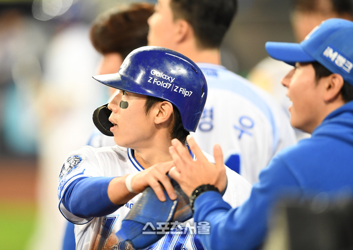 삼성 김성윤이 14일 대구 삼성라이온즈파크에서 열린 2025 KBO리그 SSG와의 준플레이오프 4차전 6회말 무사 1-2루 디아즈의 안타에 2루에서 홈으로 파고들어 득점을 한 뒤 동료들과 하이파이브르 하며 전광판을 바라보고 있다. 2025. 10. 14.