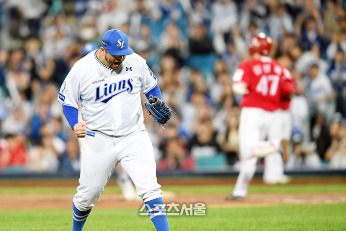삼성 선발투수 후라도가 14일 대구 삼성라이온즈파크에서 열린 2025 KBO리그 SSG와의 준플레이오프 4차전 7회초 2사 1루 상황에서 SSG 김성욱을 유격수 땅볼로 잡아내며 이닝을 마치면서 기뻐하고 있다. 후라도는 7이닝 무실점의 호투를 펼쳤다. 2025. 10. 14.