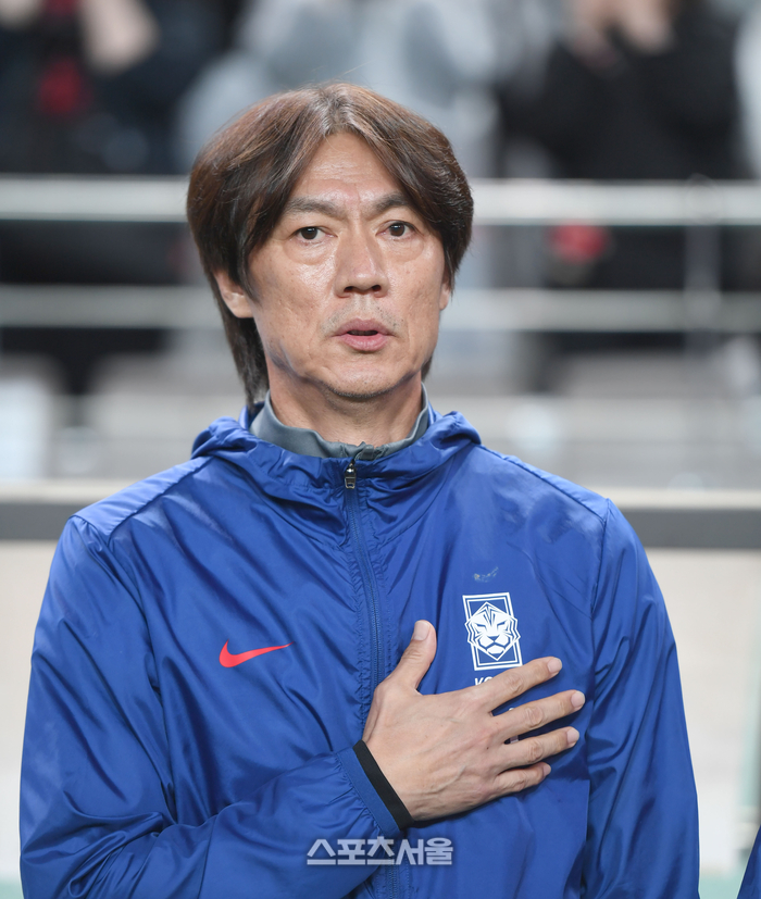 홍명보 감독이 14일 서울월드컵경기장에서 열린 남자 축구 국가대표 평가전 파라과이와 경기 전 국기에 대한 경례를 하고 있다.