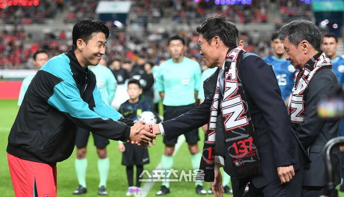 손흥민이 14일 서울월드컵경기장에서 열린 남자 축구 국가대표 평가전 파라과이와 경기 전 137경기 A매치 최다 출전 기념식에서 차범근 전 감독과 악수를 하고 있다.