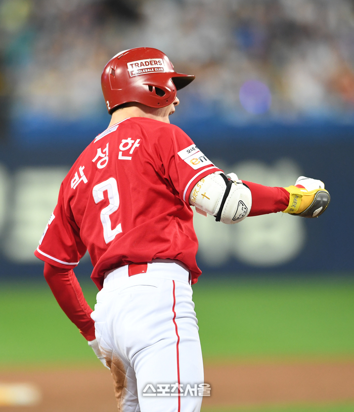SSG 박성한이 14일 대구 삼성라이온즈파크에서 열린 2025 KBO리그 삼성과의 준플레이오프 4차전 8회초 무사 1-3루 상황에서 삼성 투수 이승현을 상대로 2타점 2루타를 친 뒤 기뻐하고 있다. 2025. 10. 14.