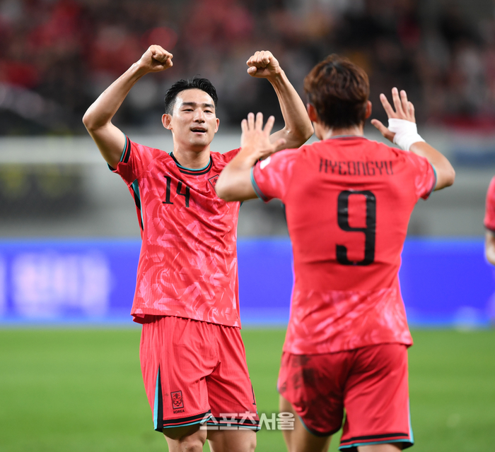 오현규가 14일 서울월드컵경기장에서 열린 남자 축구 국가대표 평가전 파라과이와 경기에서 골을 넣은 후 조유민과 환호하고 있다.