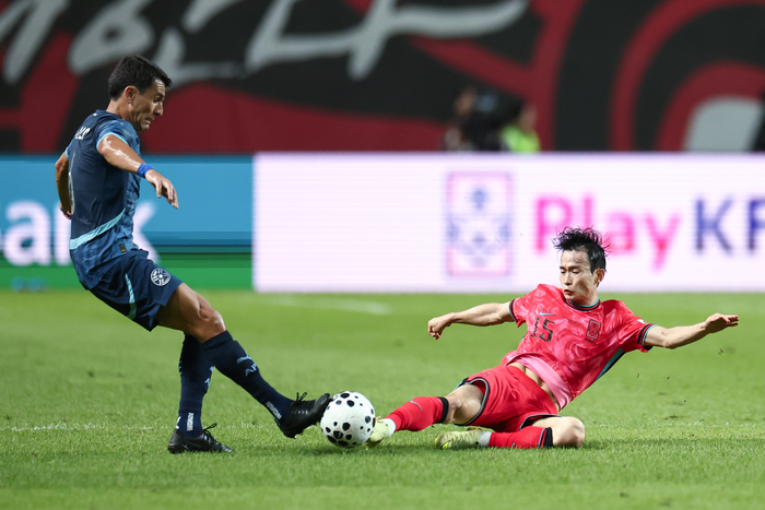 김문환은 14일 서울월드컵경기장에서 열린 파라과이와 10월 A매치 평가전에서 오른쪽 측면 수비수로 선발 출전해 풀타임을 소화했다. 축구대표팀도 엄지성과 오현규의 연속골로 2-0 승리를 따냈다. 브라질전 0-5 패배 이후 분위기 전환에 다소 성공했다.