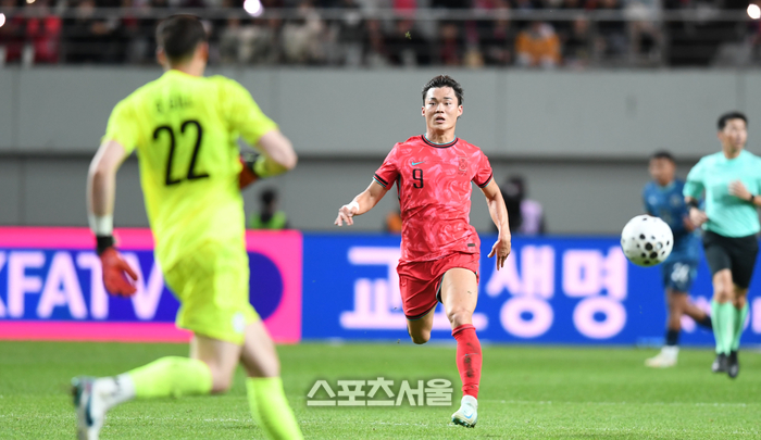 오현규가 14일 서울월드컵경기장에서 열린 남자 축구 국가대표 평가전 파라과이와 경기에서 상대 골대를 향해 전력질주하고 있다.