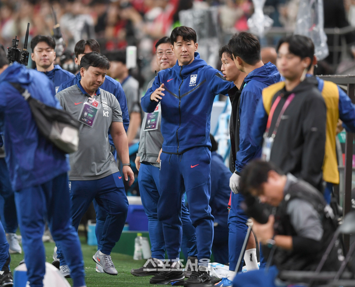 손흥민이 14일 서울월드컵경기장에서 열린 남자 축구 국가대표 평가전 파라과이와 경기 후 동료들과 악수를 하고 있다.
