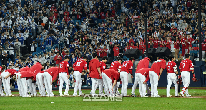 SSG 선수들이 14일 대구 삼성라이온즈파크에서 열린 2025 KBO리그 삼성과의 준플레이오프 4차전에서 삼성 2-5로 패하며 1승 3패로 플레이오프 진출이 좌절된 뒤 팬들에게 고개 숙여 인사하고 있다. 2025. 10. 14.