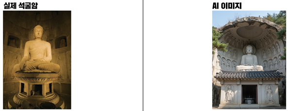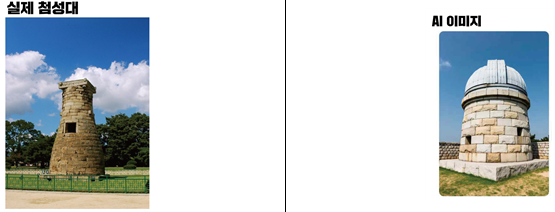 뿐만 아니라, 세계문화유산인 석굴암의 이미지를 AI에 요청하면 석굴 자체가 사라진 모습으로 묘사하는가 하면, 우리 국보인 첨성대 또한 ‘첨성대’보다 는 ‘천문대’에 가까운 모습을 생성하였다.