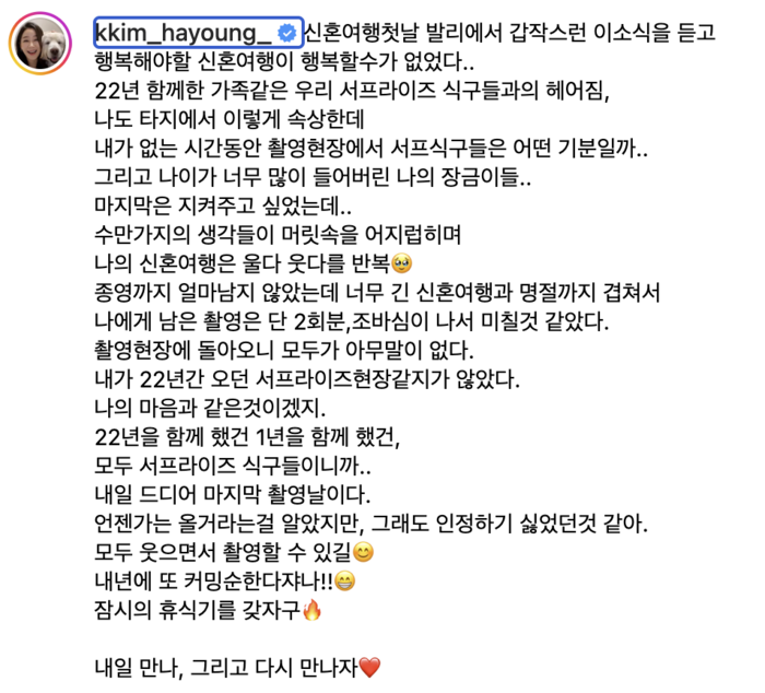 특히 김하영은 22년간 함께 해온 ‘서프라이즈’ 식구들과의 이별에 대한 상실감을 여과 없이 드러냈다. “22년 함께한 가족 같은 우리 서프라이즈 식구들과의 헤어짐”이라며, 자신이 없는 동안 촬영 현장의 분위기를 걱정하는 깊은 동료애를 보였다. 이어서 “종영까지 얼마 남지 않았는데 너무 긴 신혼여행과 명절까지 겹쳐서 나에게 남은 촬영은 단 2회분, 조바심이 나서 미칠 것 같았다”고 전하며, 프로그램에 대한 뜨거운 애정과 함께 마지막을 제대로 준비하지 못한 것에 대한 아쉬움을 토로했다.