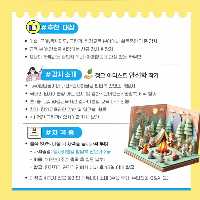 정크아티스트 안선화 작가가 진행하는 이번 프로그램은 △업사이클링의 이해 및 환경교육의 실제 △ 팝업북 구조 이해와 제작 △ 강의 설계 및 교수법 등 이론과 실습을 병행하여 운영된다. 과정 수료 후에는 민간자격인 ‘업사이클링 팝업북 전문가 2급’ 응시 자격이 부여된다.