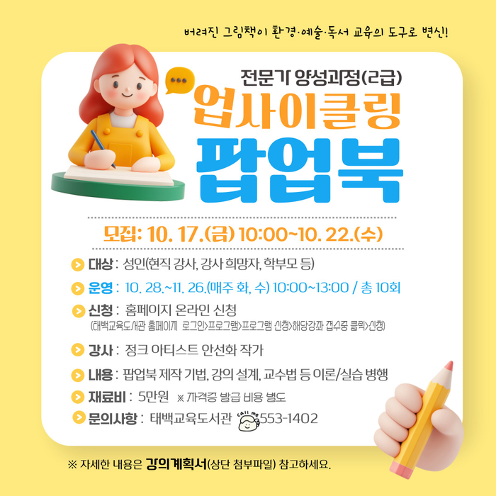 [스포츠서울ㅣ김기원기자]강원특별자치도교육청 태백교육도서관(관장 정미라)은 10월 28일(화)부터 11월 26일(수)까지 지역 내 지속 가능한 친환경 교육문화 확산 과 환경교육 전문 인력 양성을 위해 ‘2025년 업사이클링 팝업북 강사 자격과정’을 운영한다.