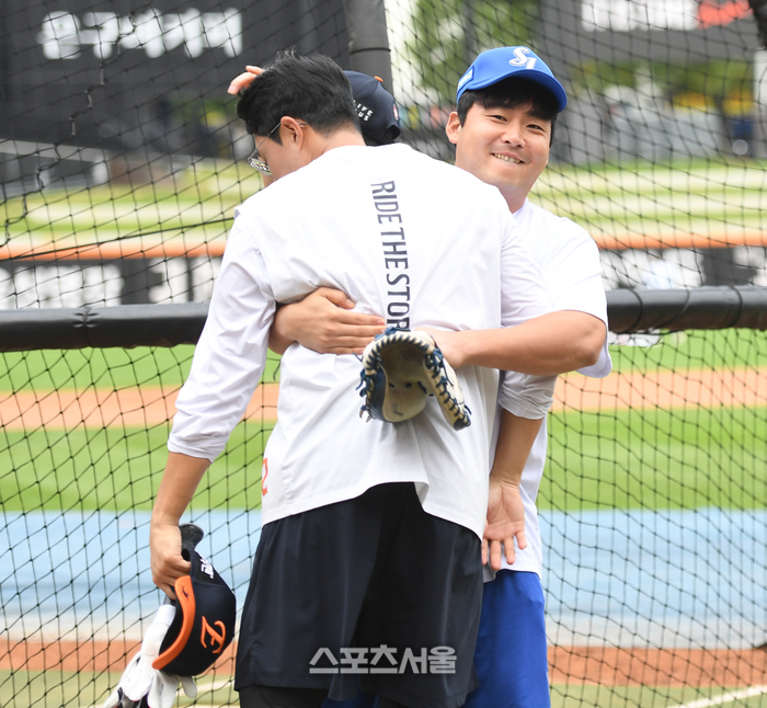 삼성 김재성이 17일 대전 한화생명볼파크에서 열리는 2025 KBO 포스트시즌 플레이오프 1차전 한화와 경기 전 채은성과 인사를 하고 있다.