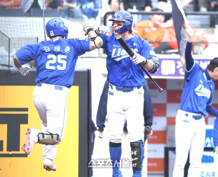 삼성 김태훈이 18일 대전 한화생명볼파크에서 열린 2025 KBO 포스트시즌 플레이오프 1차전 한화와 경기 4회초 우월홈런을 날린 후 강민호와 하이파이브를 하고 있다.