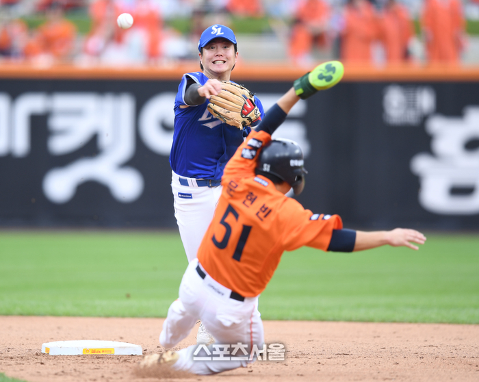 한화 문현빈이 18일 대전 한화생명볼파크에서 열린 2025 KBO 포스트시즌 플레이오프 1차전 삼성과 경기 4회말 1사1,3루 노시환 내야땅볼 때 2루에서 포스아웃되고 있다. 상대 2루수는 류지혁.