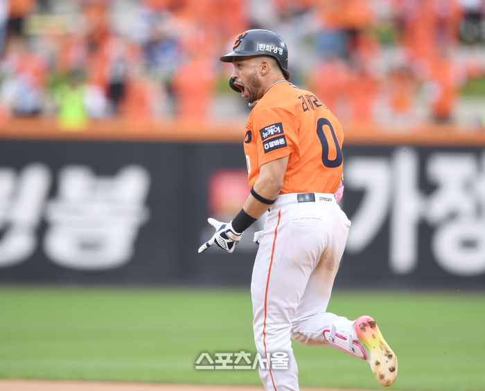 한화 리베라토가 18일 대전 한화생명볼파크에서 열린 2025 KBO 포스트시즌 플레이오프 1차전 삼성과 경기 6회말 무사2루 안타를 친 후 상대 실책을 틈 타 2루로 달려가며 선행주자를 바라보고 있다.