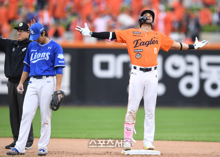한화 리베라토가 18일 대전 한화생명볼파크에서 열린 2025 KBO 포스트시즌 플레이오프 1차전 삼성과 경기 6회말 무사2루 안타를 친 후 상대 실책을 틈 타 2루까지 진루한 후 환호하고 있다.