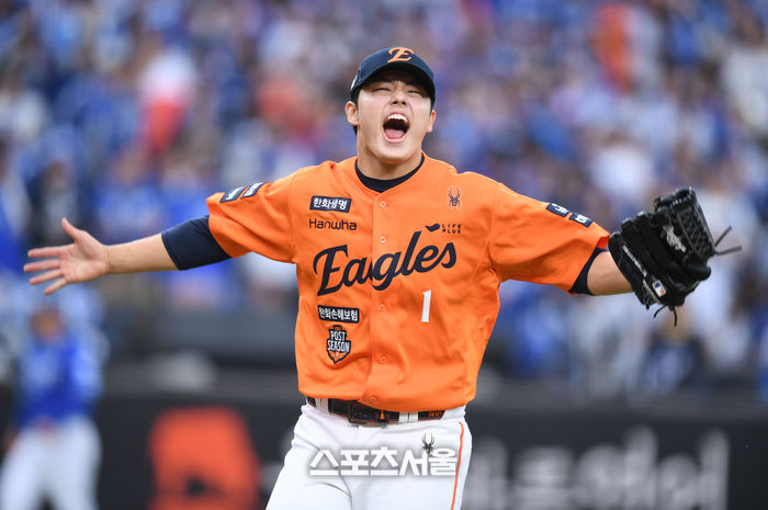 한화 투수 문동주가 18일 대전 한화생명볼파크에서 열린 2025 KBO 포스트시즌 플레이오프 1차전 삼성과 경기 7회초 2사 상대 김지찬을 내야땅볼로 처리한 후 환호하고 있다.