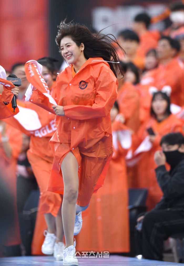 한화 치어리더 김연정이 18일 대전 한화생명볼파크에서 열린 2025 KBO 포스트시즌 플레이오프 1차전 삼성과 경기에서 응원을 유도하고 있다.