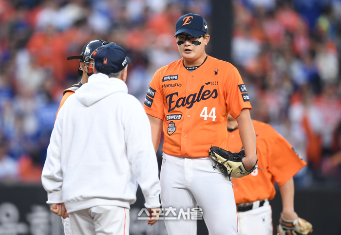 한화 김서현이 18일 대전 한화생명볼파크에서 열린 2025 KBO 포스트시즌 플레이오프 1차전 삼성과 경기 9회초상대 이재현에 홈런을 허용한 후 마운드에 방문한 김경문 감독의 이야기를 듣고 있다.