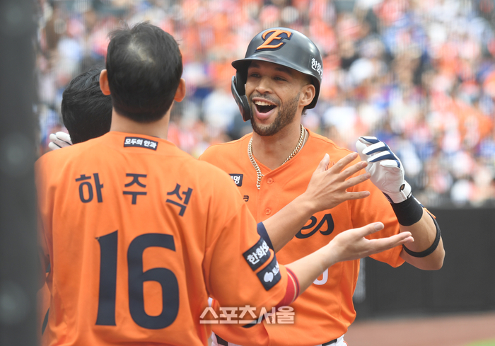 한화 리베라토가 19일 대전 한화생명볼파크에서 열린 2025 KBO 포스트시즌 플레이오프 2차전 삼성과 경기 1회말 1사 좌중월 홈런을 날린 후 하주석과 하이파이브를 하고 있다.
