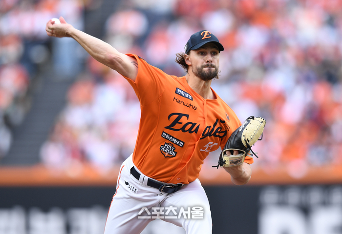 한화 선발투수 와이스가 19일 대전 한화생명볼파크에서 열린 2025 KBO 포스트시즌 플레이오프 2차전 삼성과 경기에서 역투하고 있다.