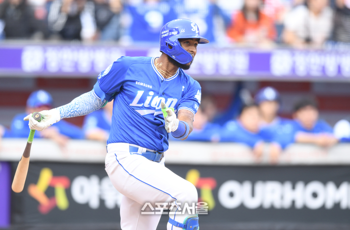 삼성 디아즈가 19일 대전 한화생명볼파크에서 열린 2025 KBO 포스트시즌 플레이오프 2차전 한화와 경기 3회초 1사1,3루 1타점 2루타를 치고 있다.