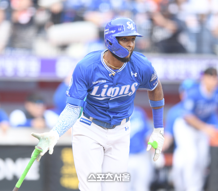 삼성 디아즈가 19일 대전 한화생명볼파크에서 열린 2025 KBO 포스트시즌 플레이오프 2차전 한화와 경기 3회초 1사1,3루 1타점 2루타를 치고 있다.