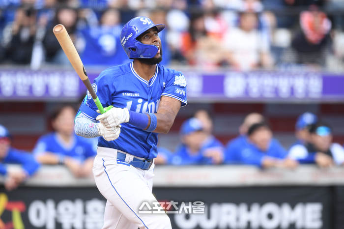 삼성 디아즈가 19일 대전 한화생명볼파크에서 열린 2025 KBO 포스트시즌 플레이오프 2차전 한화와 경기 4회초 2사1,3루 2루타를 치고 있다.