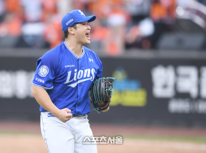 삼성 선발투수 최원태가 19일 대전 한화생명볼파크에서 열린 2025 KBO 포스트시즌 플레이오프 2차전 한화와 경기 7회말 2사 상대 권광민을 삼진처리 후 환호하고 있다.